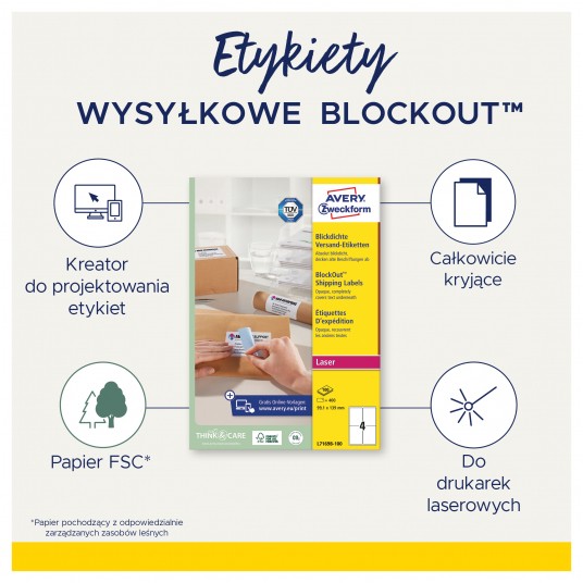 Kryjące etykiety wysyłkowe Block Out Avery Zweckform, A4, 100 ark./op., 99,1 x 93,1 mm• Białe, kryjące etykiety wysyłkowe BlockOut™ całkowicie zakrywają stare etykiety i opisy.