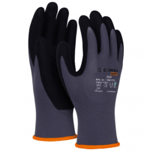 - rękawice wykonane z dobrej jakości dzianiny nylonowej z elastanem w kolorze szarym, powleczone w części chwytnej ultradrobną pianką nitrylową w kolorze czarnym
